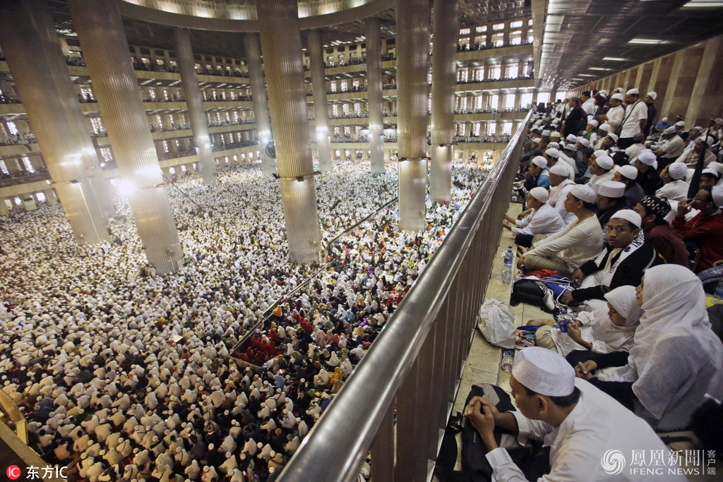 当地时间2017年2月11日,印尼雅加达,数万穆斯林在伊斯蒂克拉尔清真寺大规模祷告示威,抗议华裔省长钟万学亵渎神明,要求在下周即将举行的选举中投票穆斯林当选市长及区长。