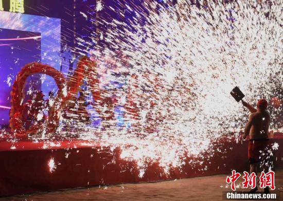 2月11日,正值中国传统节日元宵节,重庆市铜梁区举办了一场“2017年元宵晚会暨龙灯精品节目展演”。当晚,火龙表演《火树银花铜梁龙》惊艳亮相,引得全场欢呼声、尖叫声不断。龙舞,是中华民族传统民俗文化活动之一。早在明清时期,地处渝西腹地的铜梁就以“铜梁龙”工艺制作的宏大奇巧、舞技表演的粗豪而闻名川东南,2006年经国务院批准“铜梁龙舞”被列入首批国家级非物质文化遗产名录。图为铜梁火龙“铁水流星”闹元宵。周毅摄
