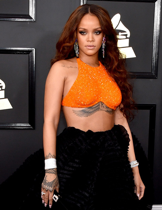 当地时间2017年2月12日晚(北京时间13日上午),美国洛杉矶,在洛杉矶的斯台普斯中心举办第59届格莱美颁奖典礼,大牌云集,明星们在红毯上大胆着装,争奇斗艳。图为蕾哈娜。