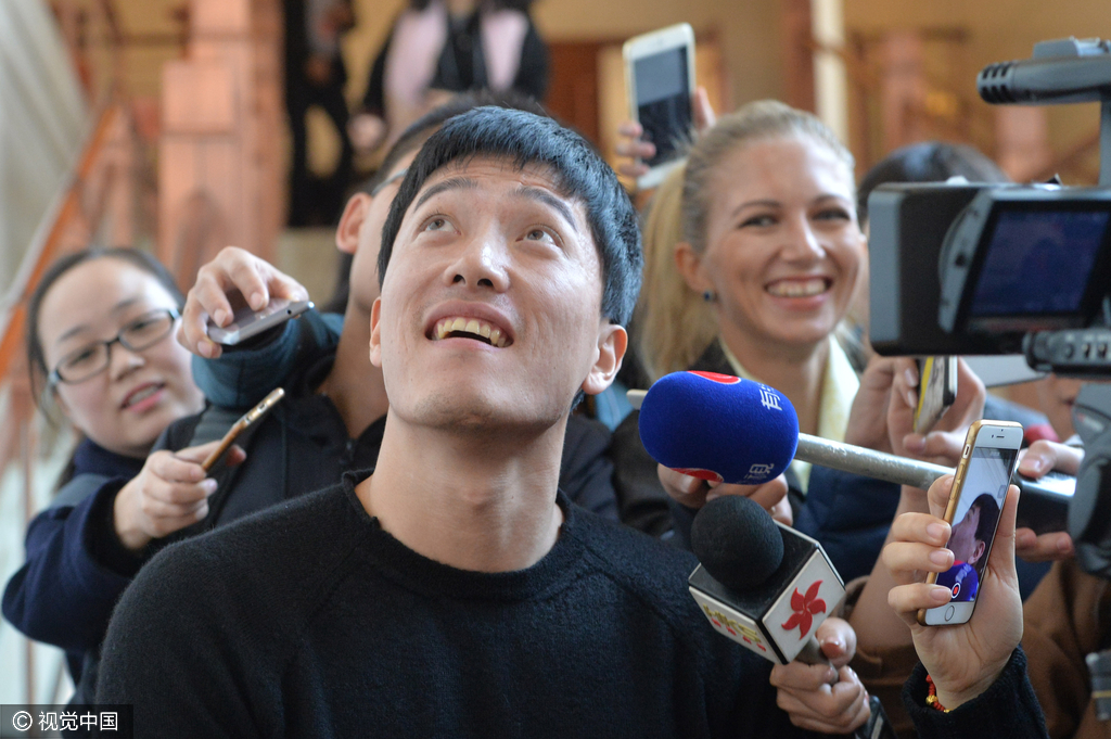 2017年3月4日,北京,刘翔参加全国政协体育界别分组讨论。会后,刘翔被记者围住采访,忙乱中走错了楼层,发现后又折返回来。供图:蓝天/视觉中国