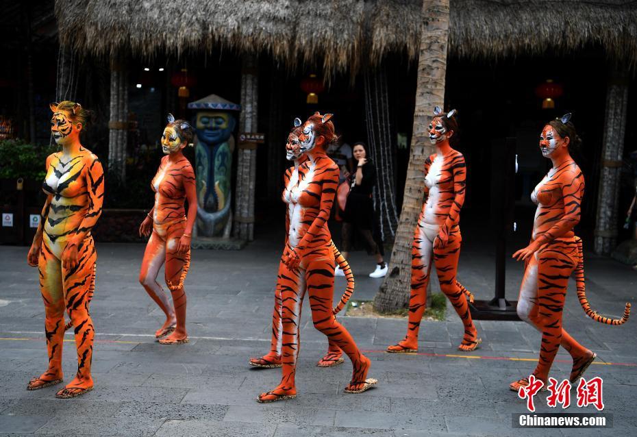 3月8日,“三八”妇女节,三亚宋城彩色动物园举行人体彩绘活动,多名模特身体被彩绘成老虎的模样在动物园内进行表演,她们用行为艺术的方式呼吁忙碌的女性们要懂得释放压力、还原自我。陈超 摄