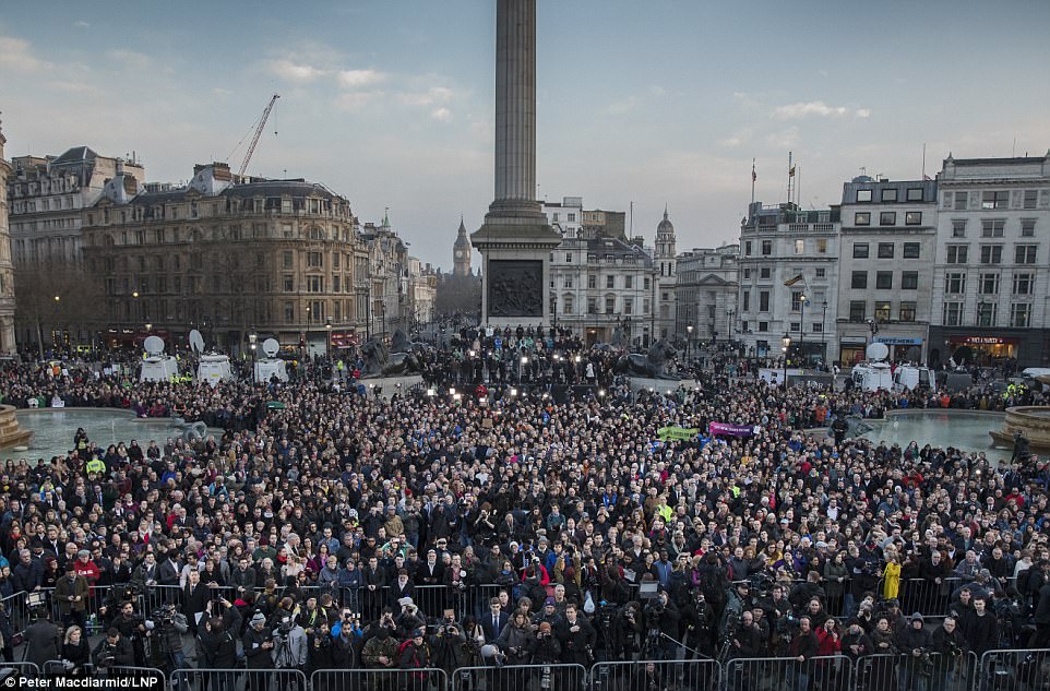 当地时间3月23日晚,伦敦市中心的特拉法加广场,伦敦市政厅为恐袭事件的遇难者举行烛光守夜活动,数千居民和游客聚集在这里,悼念受害者。