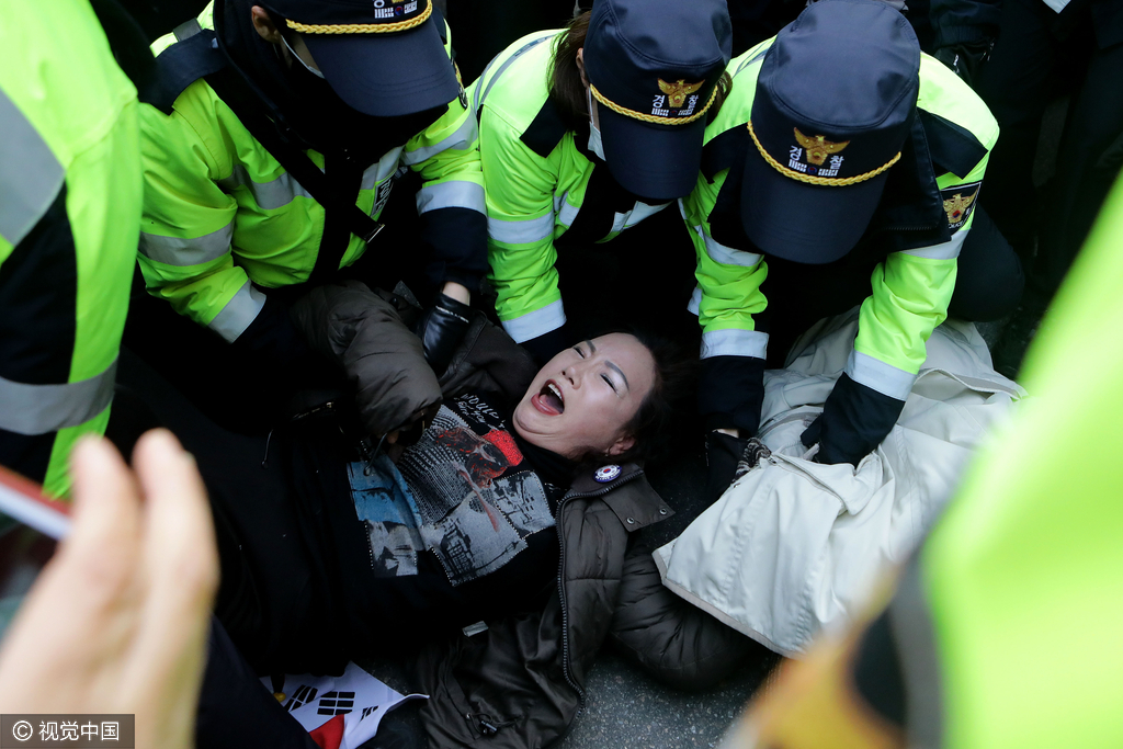 2017年3月30日,韩国法院开庭审理是否批准逮捕前总统朴槿惠,朴槿惠决定出庭接受讯问,力图阻止法院批准逮捕令。30日早上,一大批朴槿惠的支持者和反对者聚集在其宅邸外。图为现场朴槿惠的反对者与警方发生冲突,要求法庭逮捕朴槿惠。
