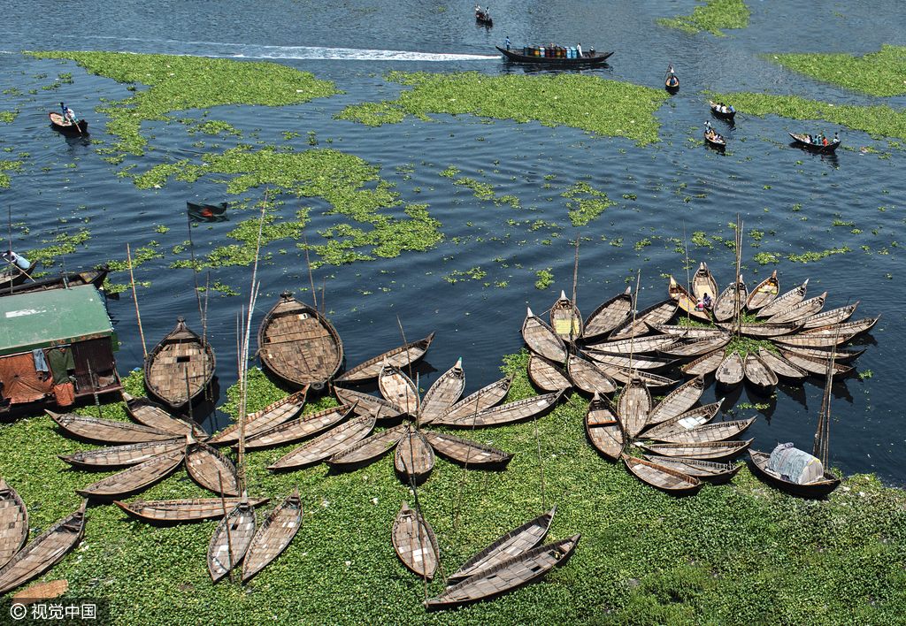 当地时间2017年3月27日,孟加拉国达卡,数百艘木船在布里甘加河畔堆放成花朵形状,等候着载郊区的乘客去往市中心的工作地。供图:Abdul Momin/视觉中国