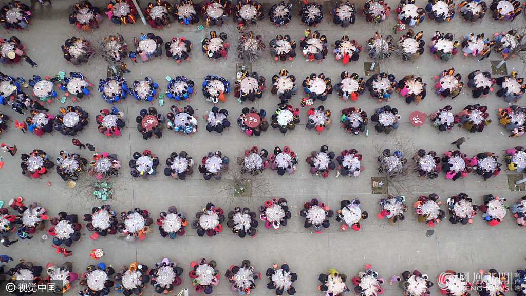 2017年4月4日,山西运城市盐湖区常平村关帝家庙,这里举办了清明节关氏宗亲大型祭拜活动。祭拜活动结束后,320桌3000多人的“团结家宴”同时开餐,蔚为壮观。来源:视觉中国