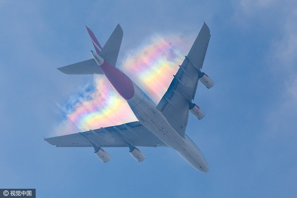 当地时间2017年4月12日,英国伦敦,英国摄影师亚当·格雷(Adam Gray)在位于伦敦南部的家中拍到了罕见的“飞机彩虹”,照片中飞机身后跟随着七色彩虹云,令人惊奇万分。供图:swns