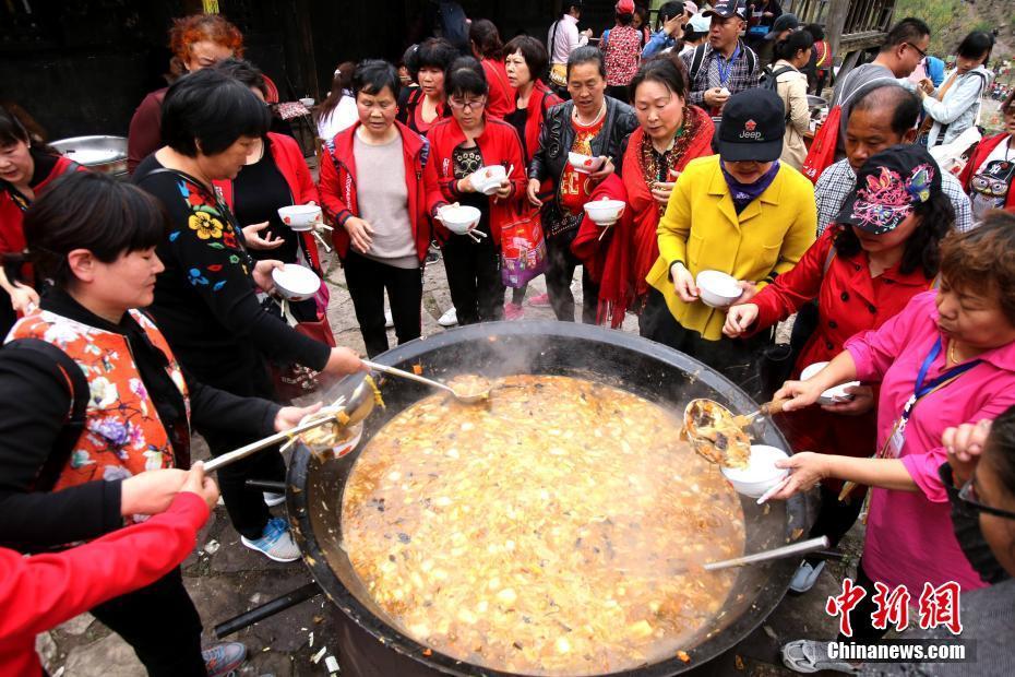 4月15日,三千余名民众汇集河南济源愚公故里的小沟背愚公村,共吃自助“大锅饭”,感受部落生活,体验农耕气息。当日,六七口大锅、十几个大盆一字排开,劈柴烧出热腾腾的大锅饭吸引大批民众一起大快朵颐。中新社记者 王中举 摄