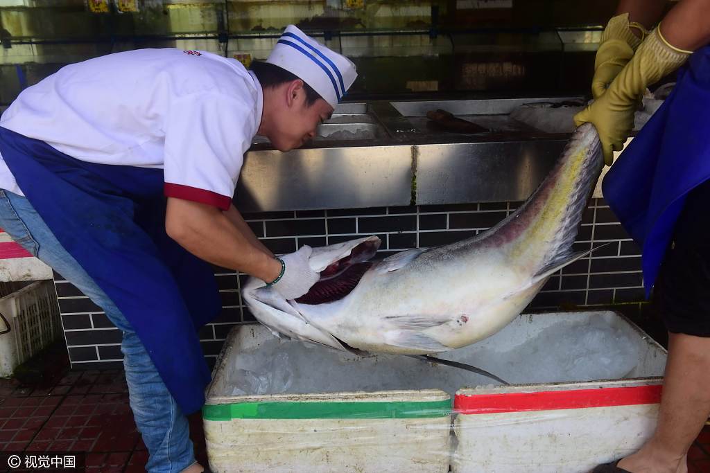 2017年4月19日报道,18日,海南琼海市渔民在潭门海域捕获一只称为“白吉”鱼的特大海鱼。这条鱼身长近1.5米,重达89斤。图为酒店厨师给刚刚到货的“白吉”鱼装箱保鲜。