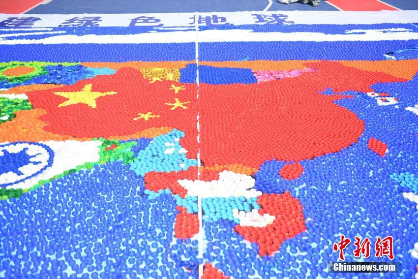 4月21日,在长春光华学院篮球场上,学生们在展示一幅用近30万个瓶盖拼成,长25米、宽12米的巨幅世界地图。该校师生以此举迎接4月22日第48个世界地球日,并倡导勤俭节约、低碳环保的意识。张瑶 摄