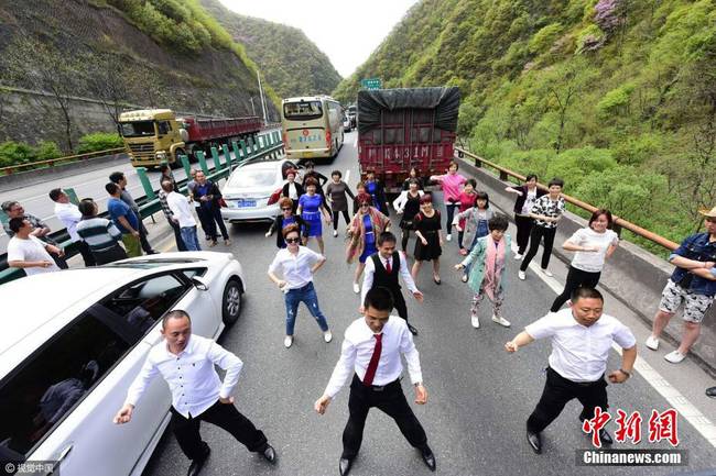 4月22日10时多,西安,在西汉高速户菜出口东边,遭遇小范围的堵车,近百辆大小不一车辆滞留等待长约半个多小时,一群从江苏总部学习返回四川的乘客,为驱散堵车心慌、心烦,跳起舞蹈解闷,顿时,不少其它车辆乘客加入欢快舞蹈人群中。图片来源:视觉中国