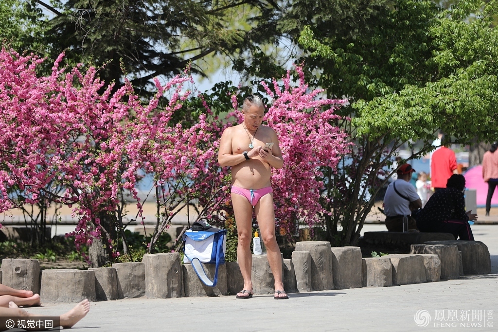 2017年5月1日,长春市南湖公园的沙滩浴场内,很多男子都穿着短裤在人行栈道上晒起日光浴。有男子将短裤挂在树上晾晒,让很多看到此景的女士不忍直视。