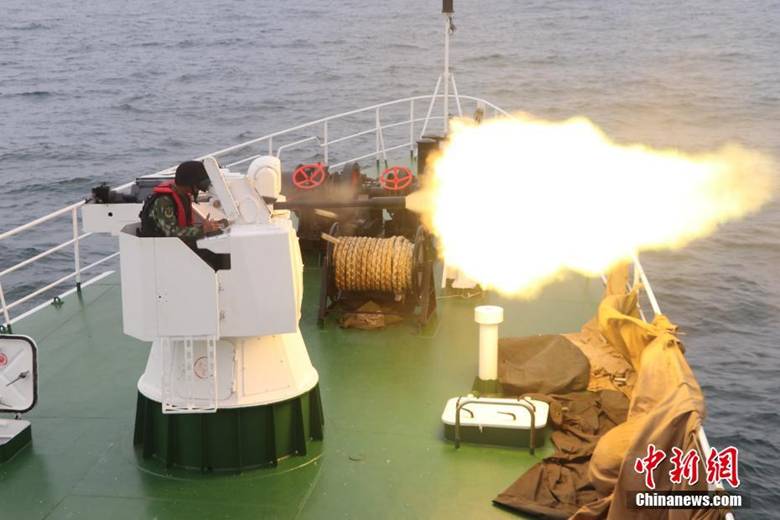 5月19日,广西海警在北部湾海域举行海上实弹射击演练。此次演练长达6个多小时,先后进行了30mm舰炮、14.5mm、12.7mm舰载高速机枪和各种轻武器的实弹射击,并对载有汽油桶的海上浮靶进行精确打击。演练旨在打击海上走私和休渔期非法捕鱼活动,提高广西海警对北部湾海域的维稳防控能力。图为30mm舰炮实弹射击。