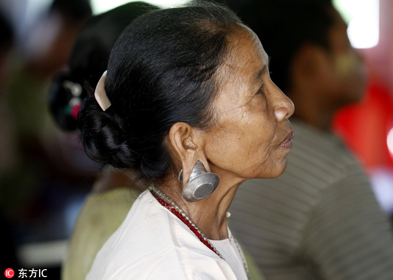 近日,缅甸百力瓦镇BaungWa小村,钦族妇女参加学校捐助仪式。钦族是缅甸第七大民族,这里的男女绝大多数都佩戴木制的大耳环,但如今,这一风俗已逐渐衰退,仅有少数妇女还秉承着穿耳洞带硕大耳环的传统。据缅甸2014年的人口普查,缅甸约有100万钦族人口,其中约48万生活在缅甸西北的钦邦,这里多山偏僻,通往外界的交通稀有,是缅甸欠发达地区之一。NYEINCHANNAING/东方IC