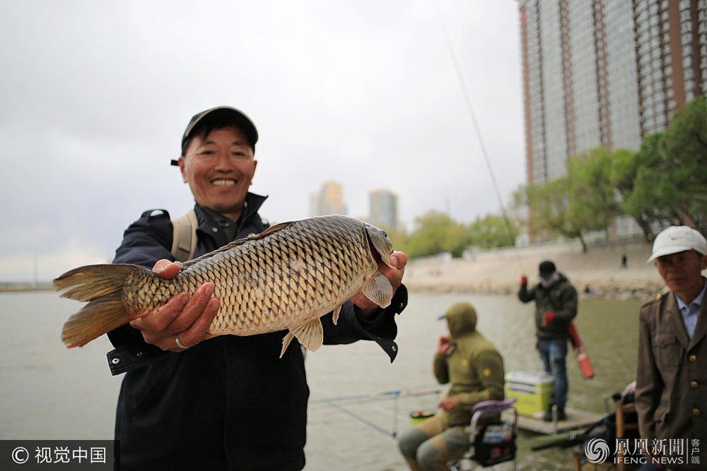 2017年5月24日,黑龙江省哈尔滨市,为缓解松花江中下游用水压力,上游小丰满水库近日加大流量放水。当日,小丰满水库放水流到哈尔滨,松花江哈尔滨城区江段水位上涨,江里大鱼增多。市民甘先生在江边接连钓上来四尾3-4斤的大鲤鱼。图:视觉中国