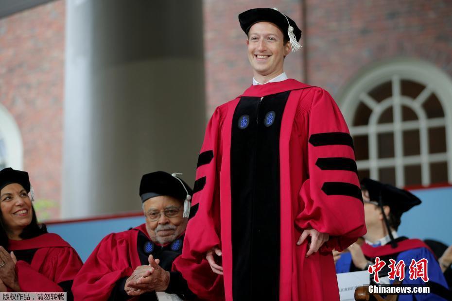当地时间2017年5月25日,美国马萨诸塞州剑桥,Facebook 总裁马克·扎克伯格参加哈佛大学第366届毕业典礼,被授予荣誉学位。