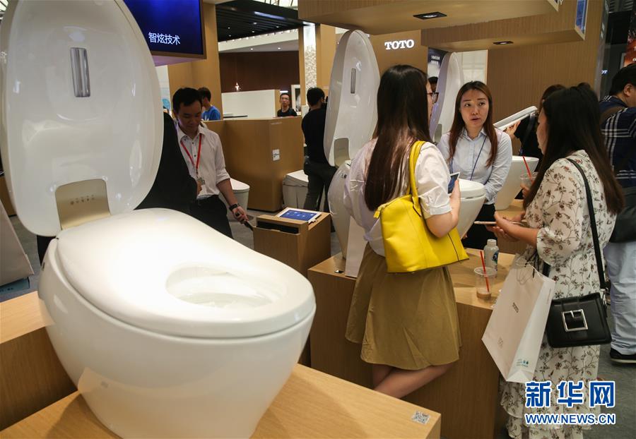 5月31日,参展商的工作人员(中)在为参观者介绍卫浴产品。当日,第22届中国国际厨房、卫浴设施展览会在上海新国际博览中心开幕。本届展会展出面积达21万平方米,来自世界各地的1100多家厂商集中展示了厨卫设备及智能化家居产品。新华社记者 丁汀 摄