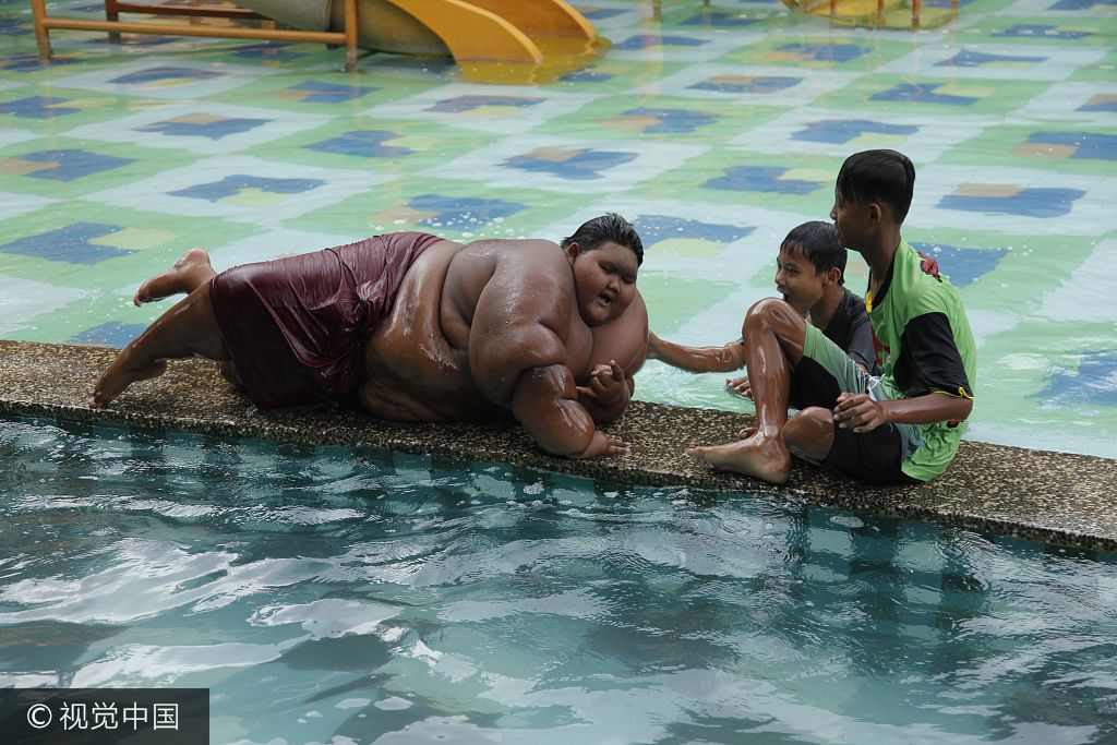 2017年6月1日讯(具体拍摄时间不详),印度尼西亚加拉横,Arya是一名11岁的男孩体重约190公斤,并且被认为是世界上最重的儿童。近日由于过度肥胖导致生命受到威胁不得不接受外科手术来减肥。图为Arya Permana坐在一个水上公园旁。