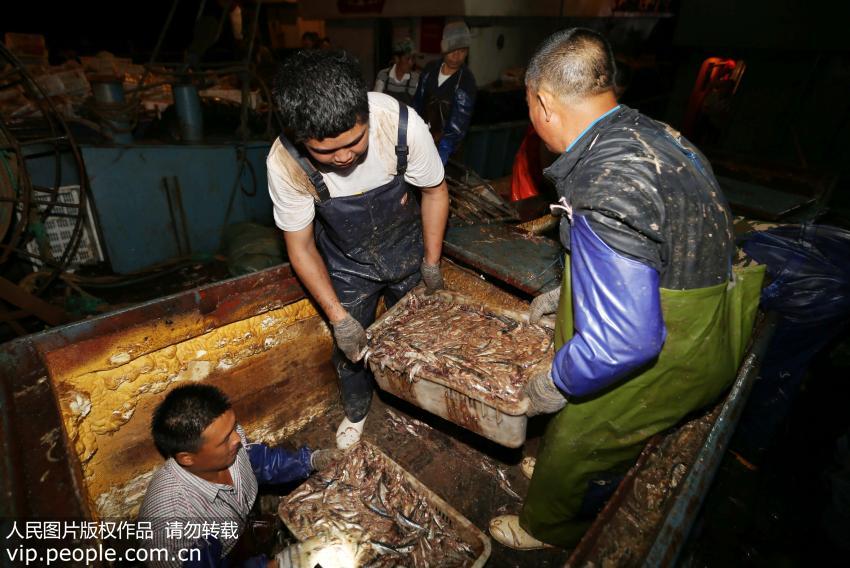 2017年6月2日凌晨,江苏省渔政监督总队直属支队执法人员在连云港海监维权执法基地连夜清点被查扣的外省籍渔船非法捕捞渔获物,总数达6800箱,14万公斤的鳀鱼和方氏云鳚等,这是10年来江苏渔政查获的最大非法捕捞刑事案件。摄影:王健民/人民图片
