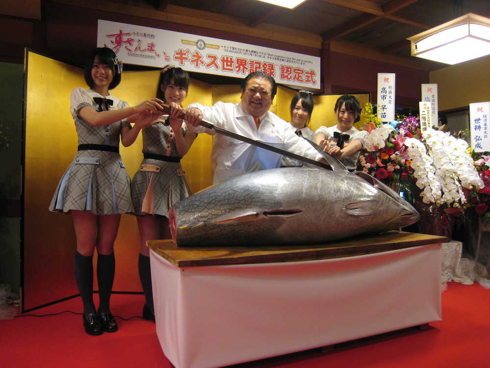 2017年6月2日报道,日本一条售价高达950多万元的金枪鱼被吉尼斯世界纪录正式认定为“世界上竞拍成交价格最高的金枪鱼”。图为吉尼斯认证仪式现场。