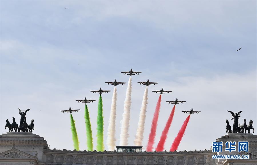 6月2日,在意大利罗马,特技飞行队在空中拉出代表意大利国旗颜色的红白绿三色烟雾,庆祝意大利共和国成立71周年。每年6月2日的共和国日也是意大利的国庆日,纪念意大利于1946年6月2日废除君主制建立共和国。来源:新华网