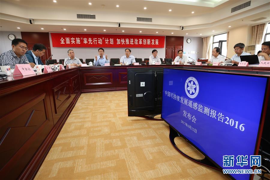 6月12日,中国科学院召开新闻发布会,发布《中国可持续发展遥感监测报告(2016)》。 《中国可持续发展遥感监测报告(2016)》是遥感监测绿皮书系列丛书的第一本,由中科院遥感与数字地球研究所联合中智科学技术评价研究中心、机械工业经济管理研究院等单位策划出版。 该报告围绕国家“十三五”规划纲要中经济社会发展25项指标中的7项建立可持续发展遥感监测的评价指标,围绕中国的土地利用、植被状况、典型城市群区域大气状况、粮食生产形势、水资源与水环境等热点问题展开论述,并就京津冀协同发展、胡焕庸线等专题问题进行分析,为国家“十三五”规划的实施提供科学数据支撑。 新华社记者 金立旺 摄