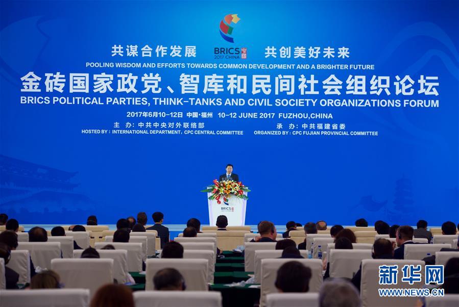 6月12日,中联部部长宋涛在金砖国家政党、智库和民间社会组织论坛闭幕式上致辞。当日,由中共中央对外联络部主办的金砖国家政党、智库和民间社会组织论坛在福州闭幕,会议通过了《福州倡议》,并就《金砖国家第九次学术论坛对金砖国家领导人厦门会晤的建议》达成一致。新华社记者 姜克红 摄