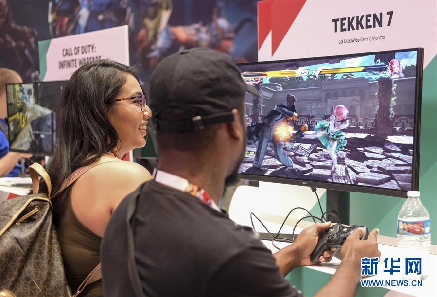 6月13日,在美国洛杉矶举行的E3电子娱乐展上,两名电子游戏爱好者体验新款电子游戏。 一年一度的E3电子娱乐展13日在洛杉矶会展中心开幕。E3展是全球规模最大、影响力最广的电脑和视频游戏及相关产品的互动娱乐贸易展会之一。新华社发(赵汉荣 摄)