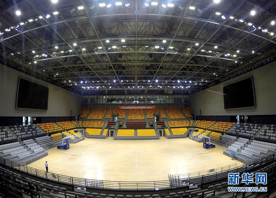 天津财经大学体育馆是第十三届全运会新建场馆之一,将承办女子篮球项目比赛。该体育馆占地面积19850平方米,共计4214个座位,是具备举办全国性篮球比赛的甲级中型体育馆。体育馆整体建筑设计风格时尚简约,比赛馆和训练馆成“两本书”的造型。图为天津财经大学体育馆内景(2017年6月14日摄)。新华社记者岳月伟摄