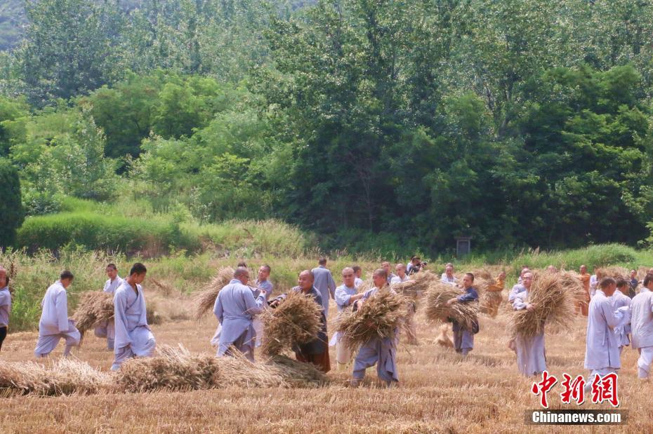 六月中旬,少林寺上百亩小麦进入丰收季。6月15日,少林寺禅耕农场的麦田里十分热闹,百余名僧人挥镰割麦,并将打好的麦粒装进编织袋,肩扛到拖拉机上,统一运回寺内储藏。据了解,少林僧人向来坚持自给自足,这在僧人们看来,农耕也是一种修行。农禅并重是少林寺的传统,僧人们也坚持“一日不作,一日不食”。图为少林僧人用最原始的镰刀收割小麦,坚持劳作。 岳龙 摄