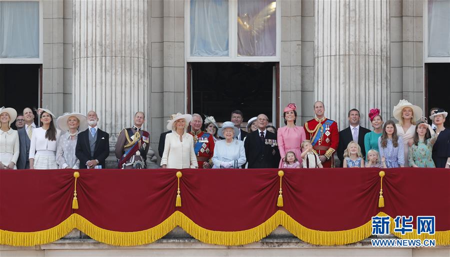 6月17日,在英国伦敦,英女王伊丽莎白二世(中)在白金汉宫阳台上观看飞行表演。当日,英国伦敦举行盛大生日庆典,庆祝英女王91岁官方生日。新华社记者 韩岩 摄