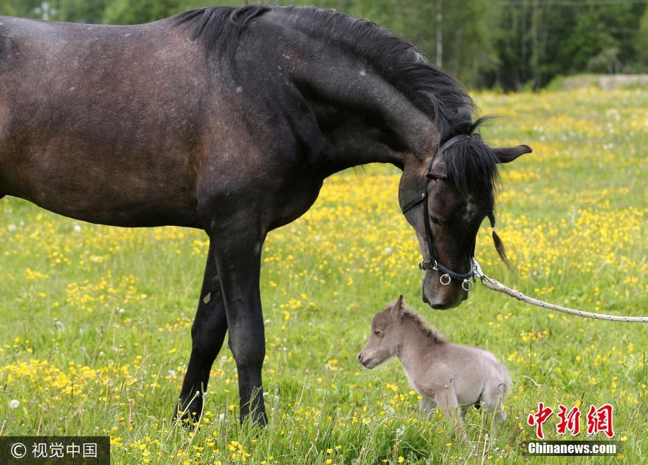 当地时间2017年6月24日,俄罗斯列宁格勒州,伊达尔戈州农场养殖的美国小型马。其中一匹小马驹出生时身高仅30厘米,体重3公斤,它将打破吉尼斯世界记录。 图片来源:视觉中国