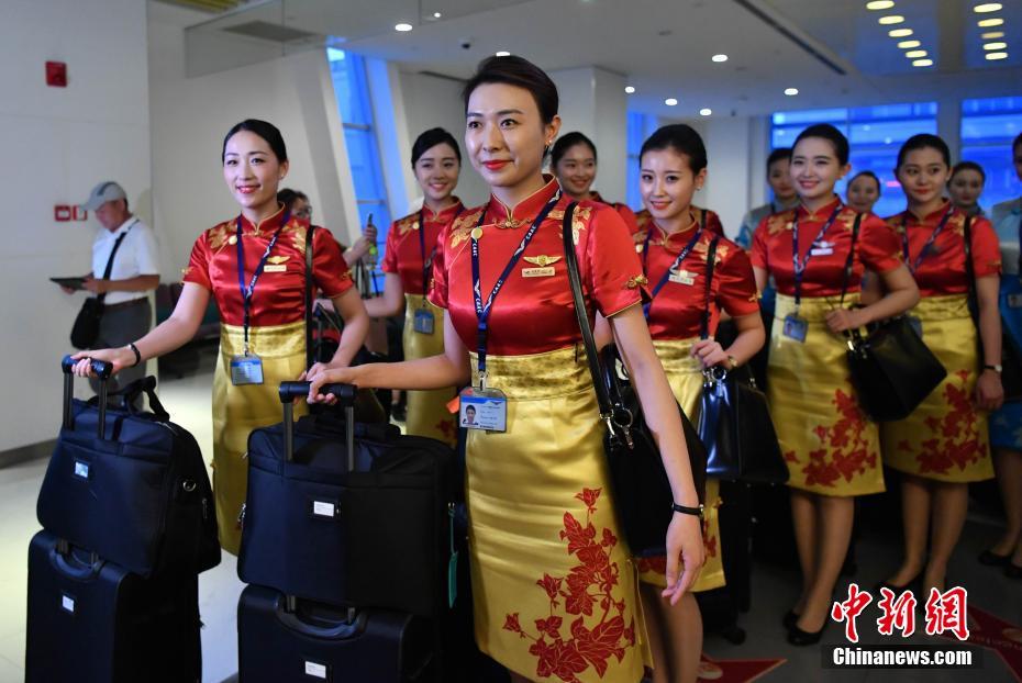 6月27日晚,在厦门—洛杉矶直飞航线首航仪式上,厦航发布了新款专包机空姐制服。这套制服采用旗袍样式,使用的材质是中国“锦绣之冠”——宋锦,特别点缀了三角梅的纹理,向世界送上来自东方的问候。王东明 摄