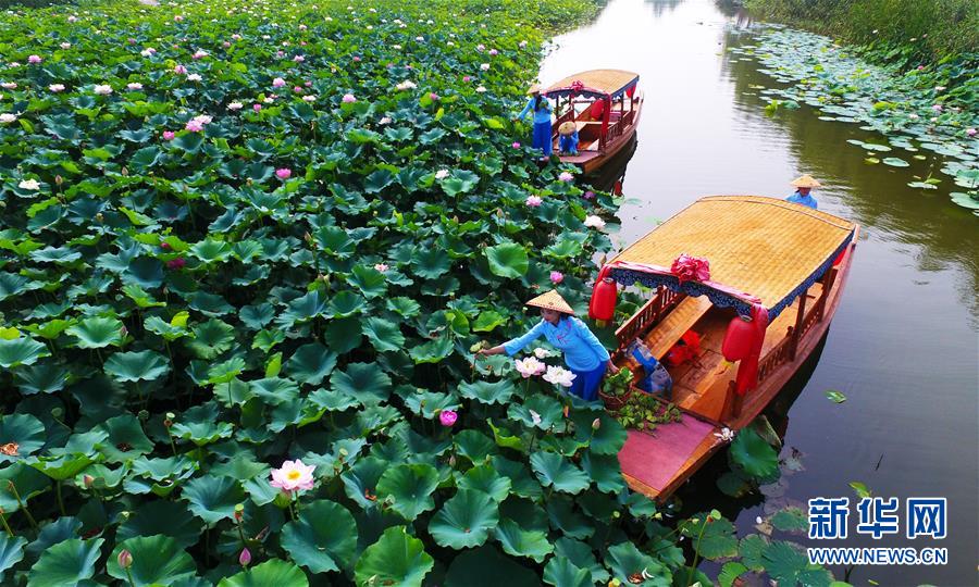 7月3日,在山东省枣庄市台儿庄运河国家湿地公园内,工作人员在采摘莲蓬。 盛夏时节,山东省枣庄市台儿庄运河国家湿地公园内2万余亩荷塘进入莲蓬采摘期,游客可以泛舟湿地间,摘莲蓬吃莲子,享受采摘乐趣。 新华社发(高启民 摄)