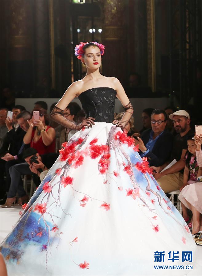 7月4日,在法国巴黎,模特展示设计师劳伦斯·许的高级定制新品。当日,设计师劳伦斯·许在巴黎举行“山里江南”2017/18高级定制新品发布会,展示设计灵感来自贵州蜡染、苗绣以及苏绣等中国传统工艺的30余套新品服装。新华社发(刘长龙)