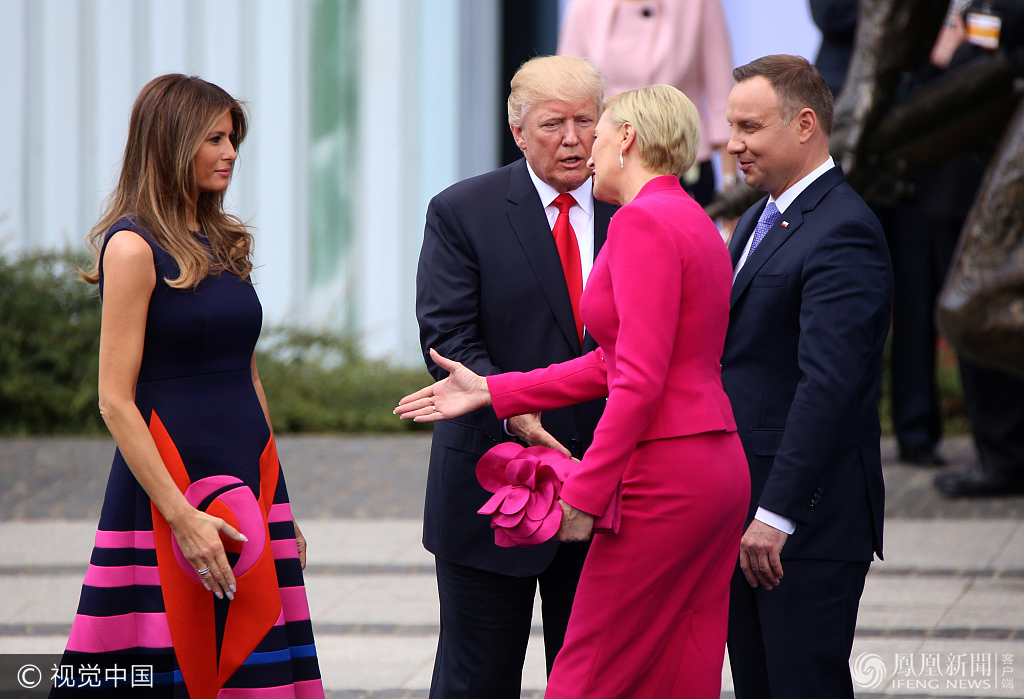 当地时间2017年7月6日,波兰华沙,美国总统特朗普访问波兰,当他第一次伸出手要与波兰第一夫人阿加塔握手时,第一夫人径直走向了特朗普的太太,不过后来又回头跟特朗普握了一次手。