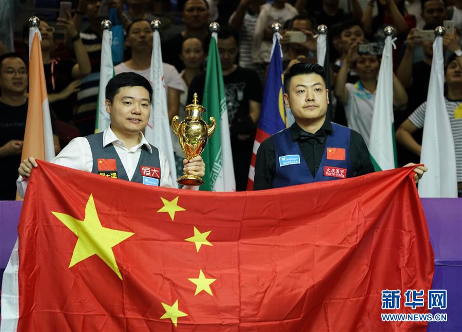 7月9日,中国A队选手丁俊晖(左)和梁文博在领奖台上。当日,在江苏省无锡市举行的2017年斯诺克世界杯决赛中,由丁俊晖/梁文博组成的中国A队以4比3战胜由特鲁姆普/霍金斯组成的英格兰队,夺得冠军。新华社记者 杨磊 摄