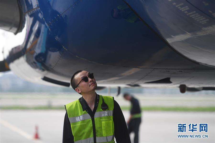 7月13日,在杭州萧山国际机场,杨威在绕机检查。 现年37岁的杨威2002年从西北工业大学毕业后,来到杭州萧山国际机场机务维修保障部成为一名机务人员,并陆续考取了13家航空公司机型执照,如今已是部门的维修主管,管理着50多名机务维修人员,负责短停飞机的检查和应急处理。每当一架客机停靠入位,提前15分钟等候的机务人员会拿起一沓检修单,走上停机坪,花费一小时左右时间,依次按照23个点位,环绕一周对飞机进行机械、航电等方面的检修。“长时间在室外进行作业,现在要忍受夹杂着飞机噪音的高温。萧山机场每天平均有800架次飞机,大家经常忙得连饭都顾不上吃。”杨威说,“再苦再累也容不得半点闪失,我们要确保万无一失,保证每一架航班安全起降。”新华社记者 黄宗治 摄