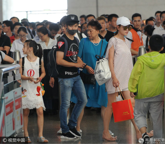 7月15日,田亮一家四口上海高铁站回北京,叶一茜条纹衫身材微胖,小儿子田宸羽获专人抱着上下楼梯,“森碟”田雨橙白裙成“小大人”。