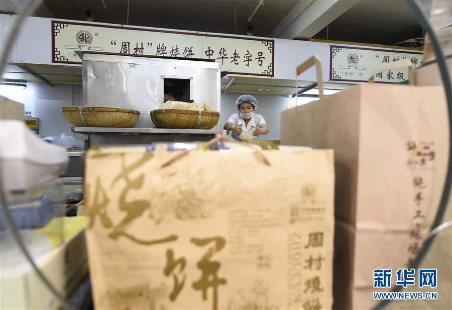 7月17日,山东淄博周村烧饼博物馆的工人在制作烧饼。周村烧饼作为山东的一种传统小吃,至今已有1800多年的历史,烧饼制作一直沿用传统配方和工艺。2008年,周村烧饼传统手工技艺入选第二批国家级非物质文化遗产名录。近年来,周村烧饼充分利用现代电商平台,创新营销机制,将产品通过网络销售到全国各地。新华社发(董乃德 摄)