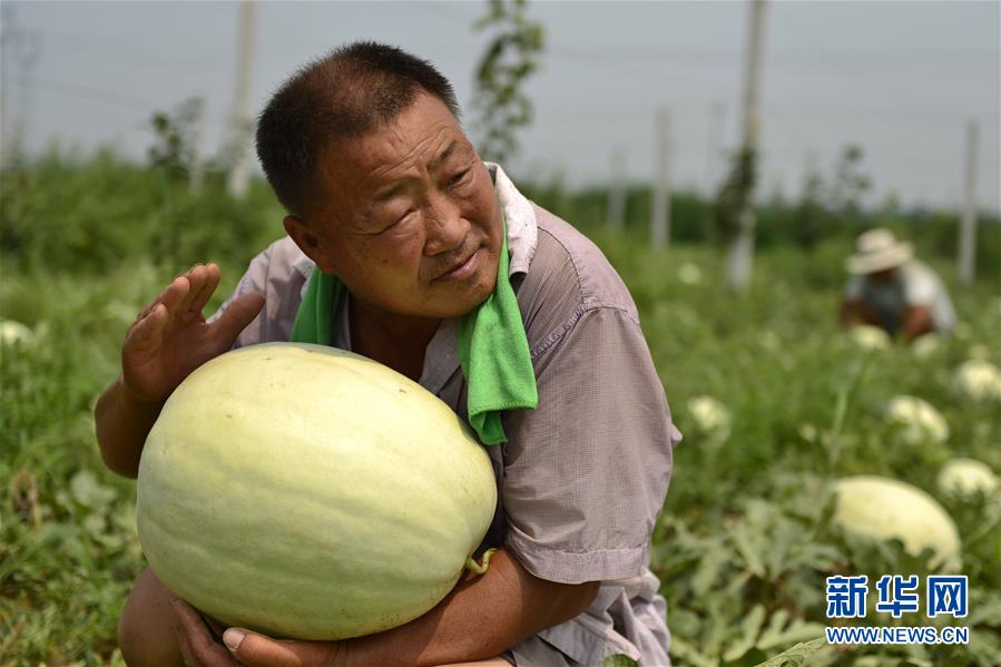 7月19日,河北省威县吴王目村农民郭春学在挑选“三白西瓜”。 “三白西瓜”是河北省邢台市威县的特色农产品,种植历史悠久,以白皮、白瓤、白籽而闻名。该瓜具有富含氨基酸,口味甘甜,是农业部认定的国家地理标志产品。近年来,威县将“三白西瓜”当做富民产业大力扶持,实行统一种植、统一技术、统一管理等模式,助力瓜农拓宽致富门路。新华社发(陈雷 摄)