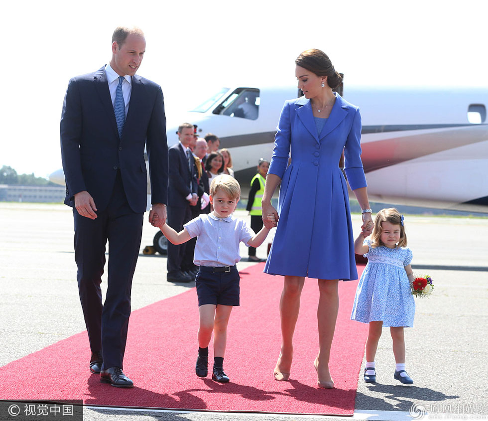 当地时间2017年7月19日,德国柏林,英国威廉王子(Prince William)携凯特王妃(Kate Middleton)以及他们的孩子乔治小王子、夏洛特小公主抵达德国进行访问。乔治小王子牵着爸爸的手,看起来睡意朦胧,不停揉眼;夏洛特小公主则是把一张小脸埋进手里的花束,猛闻花香,可爱的模样萌化人心。(图文/视觉中国)