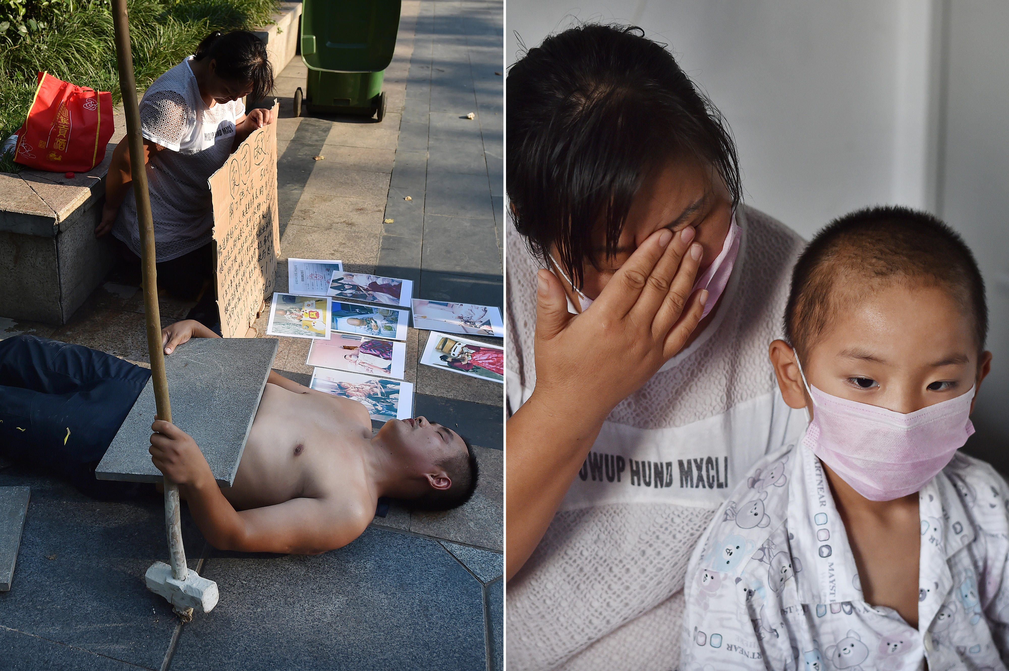 7月21日,合肥气温高达37度,下午四点多,合肥逍遥津广场上,一民工赤膊躺在灼热的地面上,胸口放着一块石头。旁边,他的妻子跪在地上举着一个牌子,上面写着“卖艺救子,胸口碎大石,50元一次。”然而,长时间里,围观者虽多,却没有一个人参与。来源:乙图