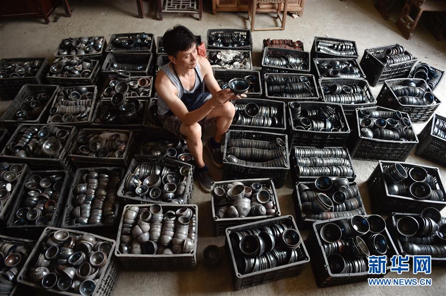 7月25日,在福建省南平市建阳区,陶艺大师陆金喜在观察一批瑕疵品,总结烧制失败的经验。 福建建阳的“建窑”曾是宋代八大名窑之一。“建窑”出产的黑釉瓷器——建盏一度经海上丝绸之路热销海外。宋代之后,由于战乱等诸多因素,建盏烧制技艺失传数百年。近年来,在当地政府和陶艺工匠的努力下,建盏烧制技艺得以迅速恢复和发展,“建窑建盏烧制技艺”被列入国家级非物质文化遗产名录,一些失传已久的建盏烧制技法和釉面品类逐渐被复原。陶艺大师陆金喜就是复原“曜变”建盏烧制技艺的探索者和先行者。 45岁的陆金喜是福建省级陶艺大师、高级技工。生于建盏的发祥地,陆金喜与建盏结下不解之缘。数十年来,陆金喜潜心钻研建盏烧制技艺,通过查阅古代文献、搜集古建盏碎片,运用现代科技检测出碎片中各元素含量,并不断调整、摸索瓷胎和釉面成分的熔解温度和化学反应时机,最终掌握“曜变”建盏烧制技法。目前,他的多件“曜变”建盏作品已被英国、日本等国家和地区的多家博物馆收藏。 新华社记者 宋为伟 摄