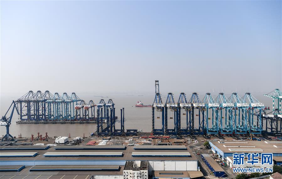 在位于上海长兴岛的振华重工长兴基地,振华重工制造的岸桥排列在生产码头上(7月27日摄)。 成立于1992年的上海振华重工(集团)股份有限公司是世界最大的港口机械制造商。截至2017年7月,振华重工的产品已进入全球98个国家和地区,其中岸边集装箱起重机(岸桥)产品占全球市场份额超过80%,连续19年保持全球市场占有率第一。新华社记者 申宏 摄