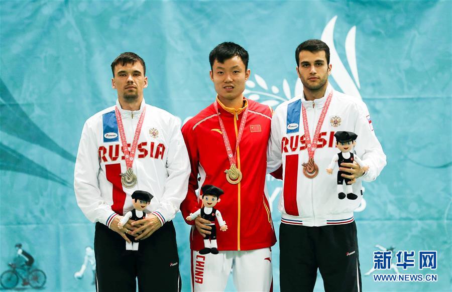 7月28日,冠军中国选手唐楷峰(中),亚军俄罗斯选手卡尔波夫(左)和季军俄罗斯选手古洛姆若达在颁奖仪式上。 当日,在土耳其萨姆松举行的第23届夏季听障奥运会羽毛球男单决赛中,中国选手唐楷峰以2比0战胜俄罗斯选手卡尔波夫,获得冠军。新华社发(穆斯塔法·卡亚 摄)