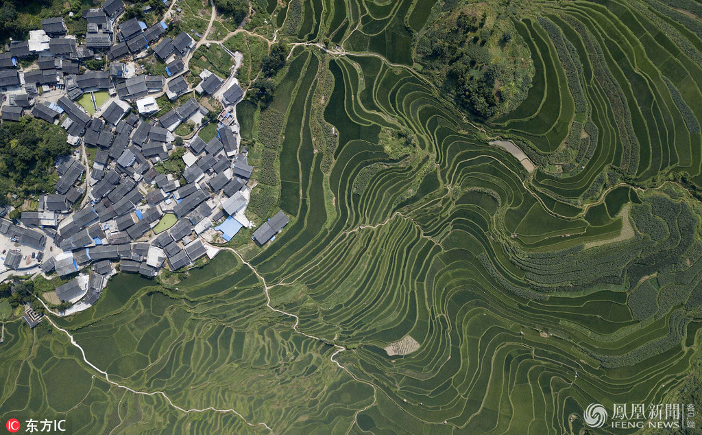 2017年7月29日,盛夏时节,贵州省丹寨县龙泉镇高要梯田一片绿意盎然,梯田层层叠叠,美轮美奂,在连绵起伏的青山上绘制出美丽的画卷,从空中鸟瞰犹如一幅画卷,美不胜收。来源:东方IC