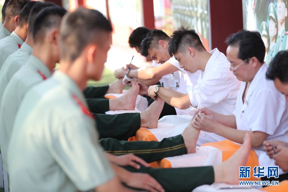 国旗护卫队肩负着天安门广场升旗、降旗和护旗的任务,每天进行着高强度的训练,脚部承受着很大压力。7月29日八一建军节前夕,北京五指生拥军服务队来到北京天安门国旗护卫队,为战士们进行义务修脚治疗,并进行颈肩、足部健康知识讲座。 五指生拥军服务队2006年成立至今,坚持每年不定期为天安门国旗护卫队战士们义务提供足部护理、健康讲座等服务。新华网发(王超摄)