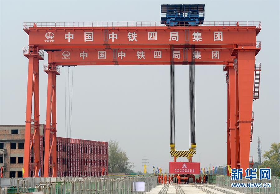 西安北至机场城际轨道工程架梁施工现场(8月1日摄)。 8月1日,陕西境内首条城际铁路——西安北至机场城际轨道工程顺利架设首孔箱梁,标志着该工程正式进入架梁施工阶段。西安北至机场城际轨道工程连接西安市陆空两大综合交通枢纽,起自西安北站北广场,向北跨越渭河,经秦汉新城、空港新城至西安咸阳国际机场,全长29.31千米,共设车站10座,设计时速100公里/小时,建成后最大运能可达到每日30万人次。新华社记者 刘潇 摄