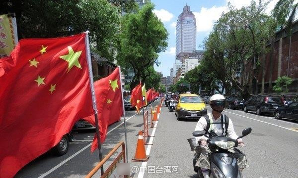8月8日,台“立法院”周边出现整排五星红旗。属统派的“爱国同心会”在“立法院”外扎营,将“立院”旁的青岛东路一侧布置满五星红旗及各种标语如“台湾大陆同属中国反‘台独’促统一”等,引起往来民众的注意。来源:中国台湾网