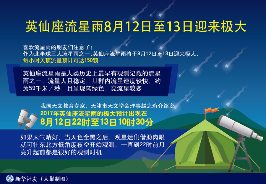 图表:英仙座流星雨8月12日至13日迎来极大 新华社发 大巢制图 新华社天津8月10日电(记者周润健)喜欢流星雨的朋友们注意了!作为北半球三大流星雨之一,英仙座流星雨将于8月12日至13日迎来极大,每小时天顶流量预计可达150颗。 英仙座流星雨是人类历史上最早有观测记载的流星雨之一,流量大且稳定,其群内流星速度较快,约为59千米/秒,且呈现蓝绿色,亮流星较多。一般情况下,英仙座流星雨的火流星都会相对提前到来,因此预报的极大当晚和之前的一晚都很适合观测。 “今年英仙座流星雨的极大预计出现在8月12日22时至13日10时30分。”我国天文教育专家、天津市天文学会理事赵之珩介绍说,如果天气晴好,当天色全黑之后,观星迷们借助肉眼就可往东北方低角度夜空开始观测,一直到22时前月亮升起前都是很好的观测时机。“极大时间开始后,英仙座流星雨辐射点已经升起,此时月光干扰还不是很大。但随着时间的推移,月光干扰会越来越大,一些暗弱流星比较难观测到,子夜过后就只能看到那些比较亮的少数流星了,因此,最好抓住前半夜的有利时机进行观测和拍照。” 天文专家提醒说,观赏这次流星雨首先要天气晴朗,并选择灯光影响小的地方,观测地点最好四周开阔,无高山或建筑物遮挡,还要注意安全。